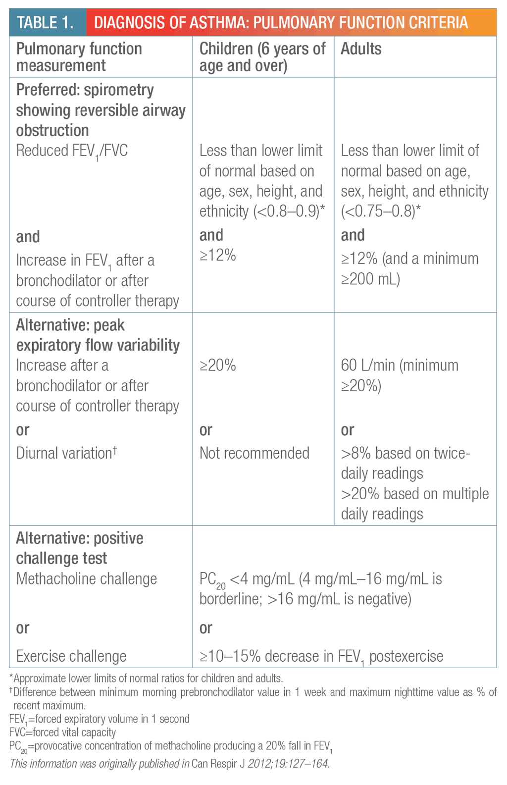 Clinical suspicion of asthma should be confirmed with objective measures of pulmonary function showing reversible airway obstruction following administration of a bronchodilator. Table 1 outlines the pulmonary function criteria for a diagnosis of asthma using the preferred method of spirometry, as well as alternative methods (e.g., peak expiratory flow, challenge tests).