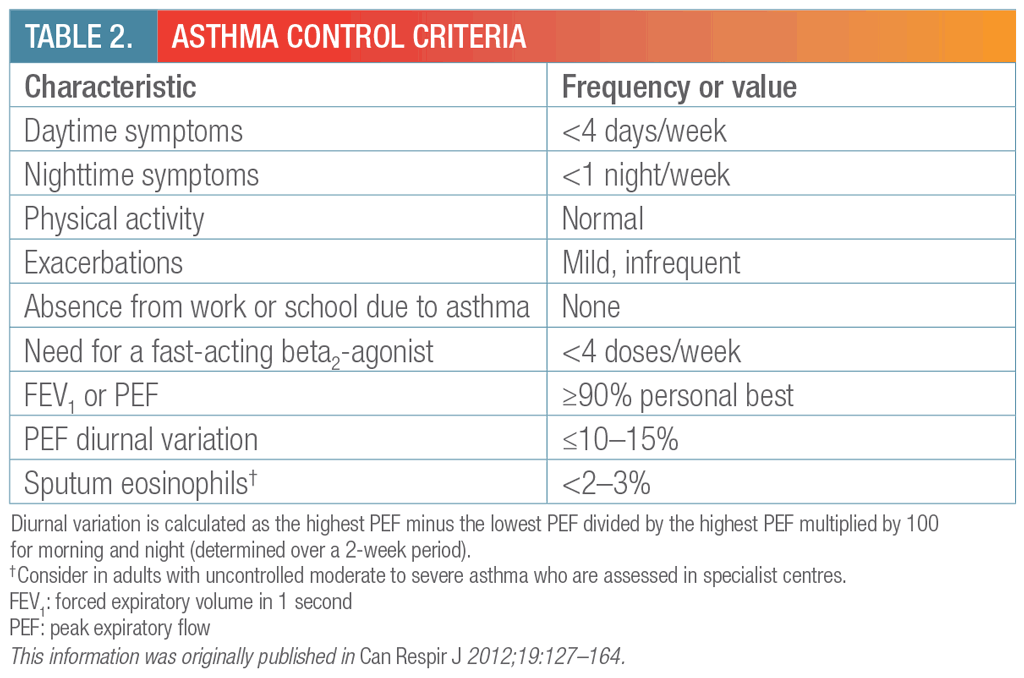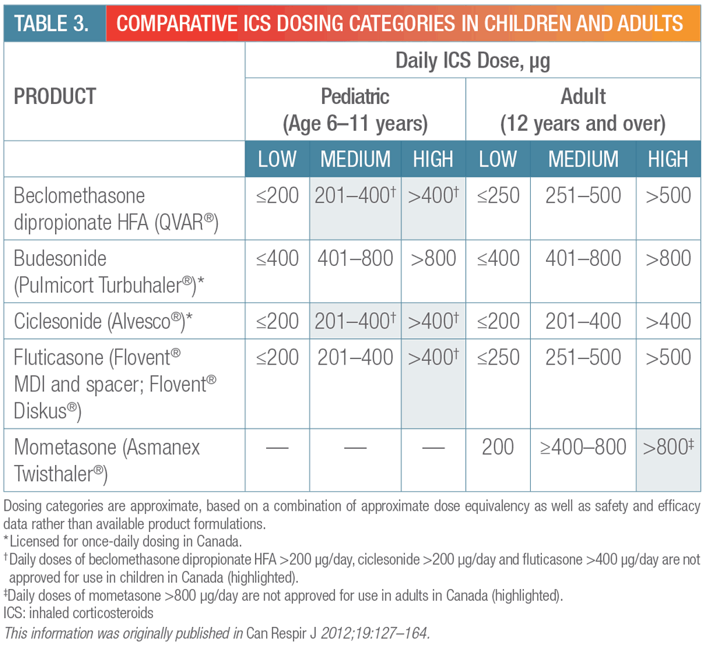 As well, clinicians are encouraged to consult the Canadian Thoracic Society 2010 consensus summary (see Lougheed MD, Lemière C, Dell SD, et al. Canadian Thoracic Society Asthma Management Continuum — 2010 consensus summary for children six years of age and over, and adults. Can Respir J 2010;17:15–24A).