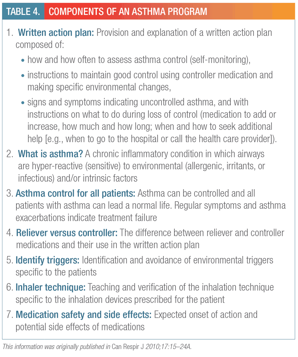 Self-management education is essential to asthma management. Key components of an educational program are outlined in Table 4.