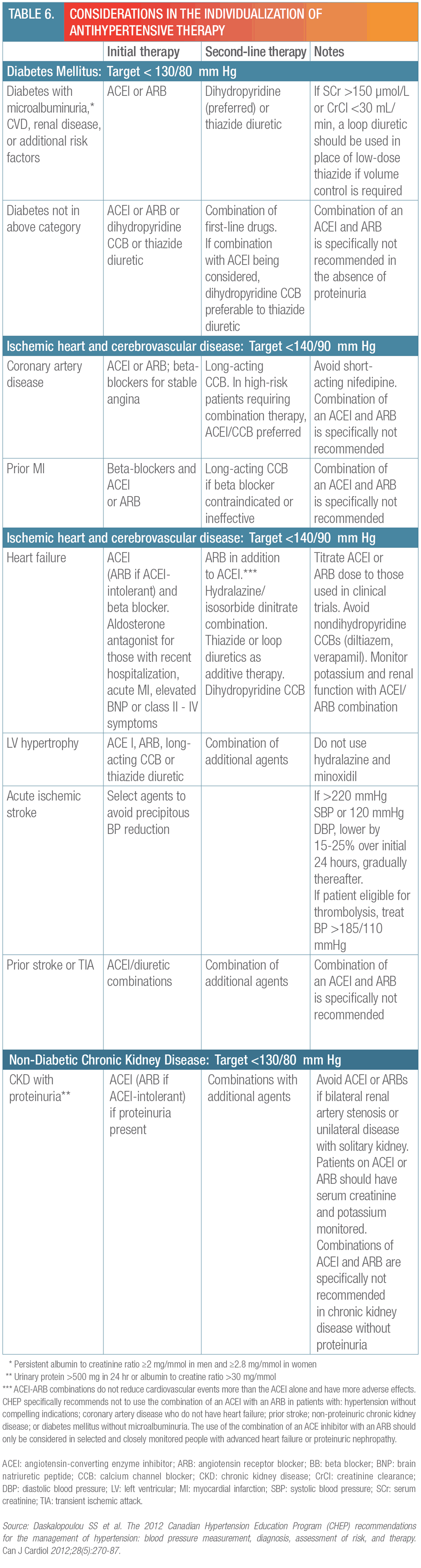CHEP also makes specific recommendations for first-line therapies in patients with concomitant diseases (Table 5). Based on data from the ONTARGET trial, a new recommendation is that most patients with ischemic heart disease should receive an angiotensin-converting enzyme inhibitor (ACEI) or angiotensin receptor blocker (ARB) (in patients with heart failure, ACEI are preferred). In addition, based on the ACCOMPLISH trial results, CHEP indicates that for selected high-risk individuals with CAD, the combination of an ACEI and calcium channel blocker (CCB) should be considered.